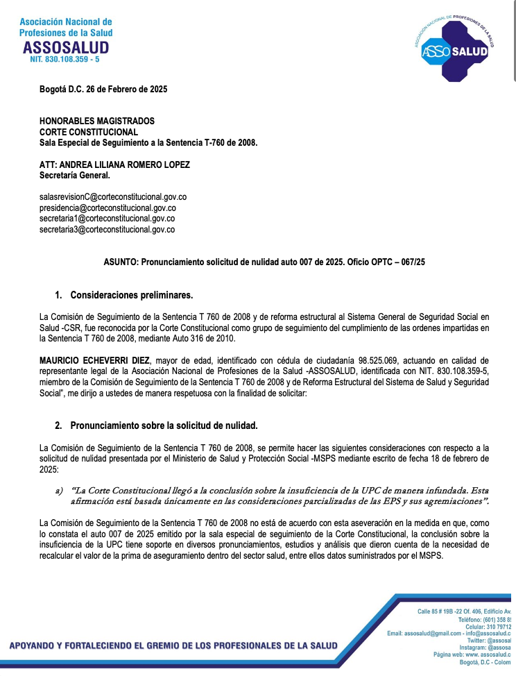 El Presidente de ASSOSALUD, Mauricio Echeverri Diez, agradece la oportunidad brindada por la Corte Constitucional para ampliar la información previamente remitida de manera conjunta con otras organizaciones del sector salud. Desde la presentación de dicha comunicación, el contexto jurídico ha evolucionado de manera significativa.